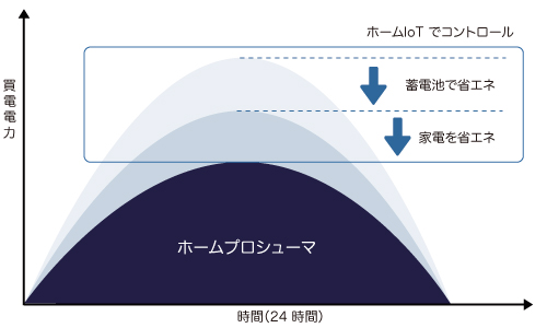 ホームプロシューマは、ホームIoTでハイブリッド蓄電池をAI制御することにより2段階で省エネします。先ず、太陽光発電や蓄電池に貯めた太陽光発電の電気をピーク時間帯に使うことで省エネします。次に、ホームIoTで家電をAI制御することで、更に省エネします。