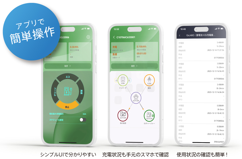 スマホやPCで充電器状態・充電状況の監視や、充電の開始・終了操作が可能。