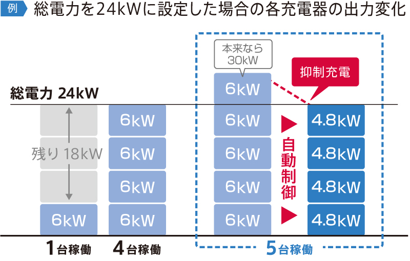 複数台の充電器を設置した場合でも、予め使⽤できる電⼒の上限設定をしておくことで、それを超過しないよう各充電器の出⼒を⾃動的に調整