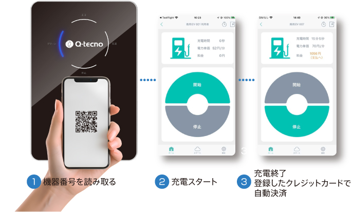 スマートフォンで簡単にEV充電器の利⽤料⾦を課⾦決済できる機能を搭載