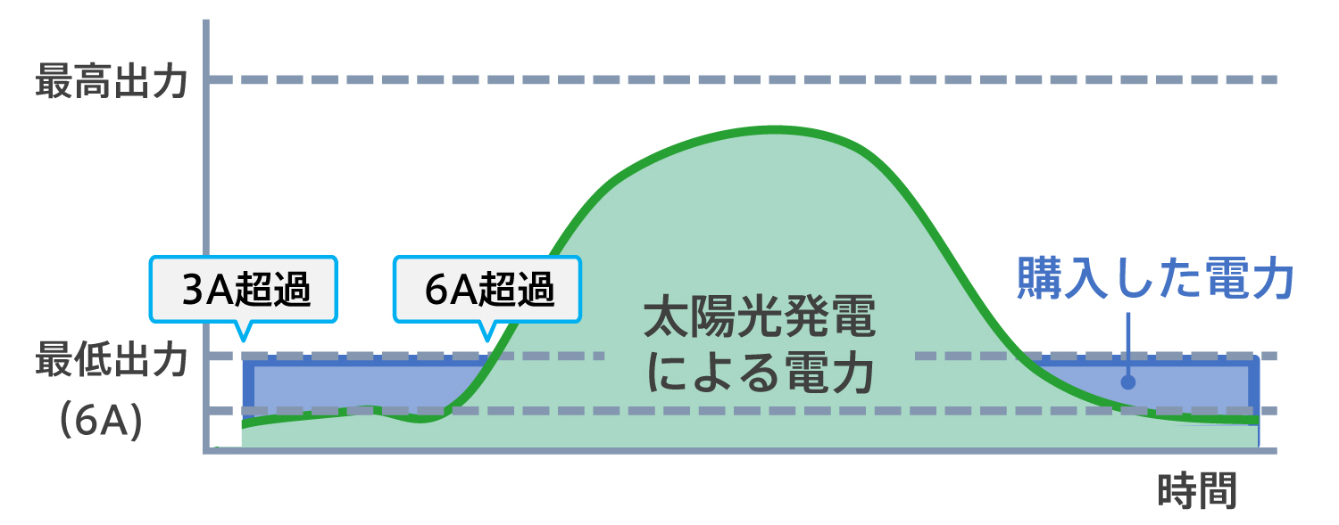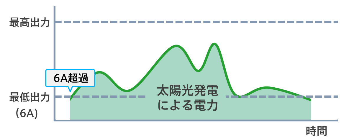 太陽光発電による電力が最低出力(6A)に達すると充電を開始。