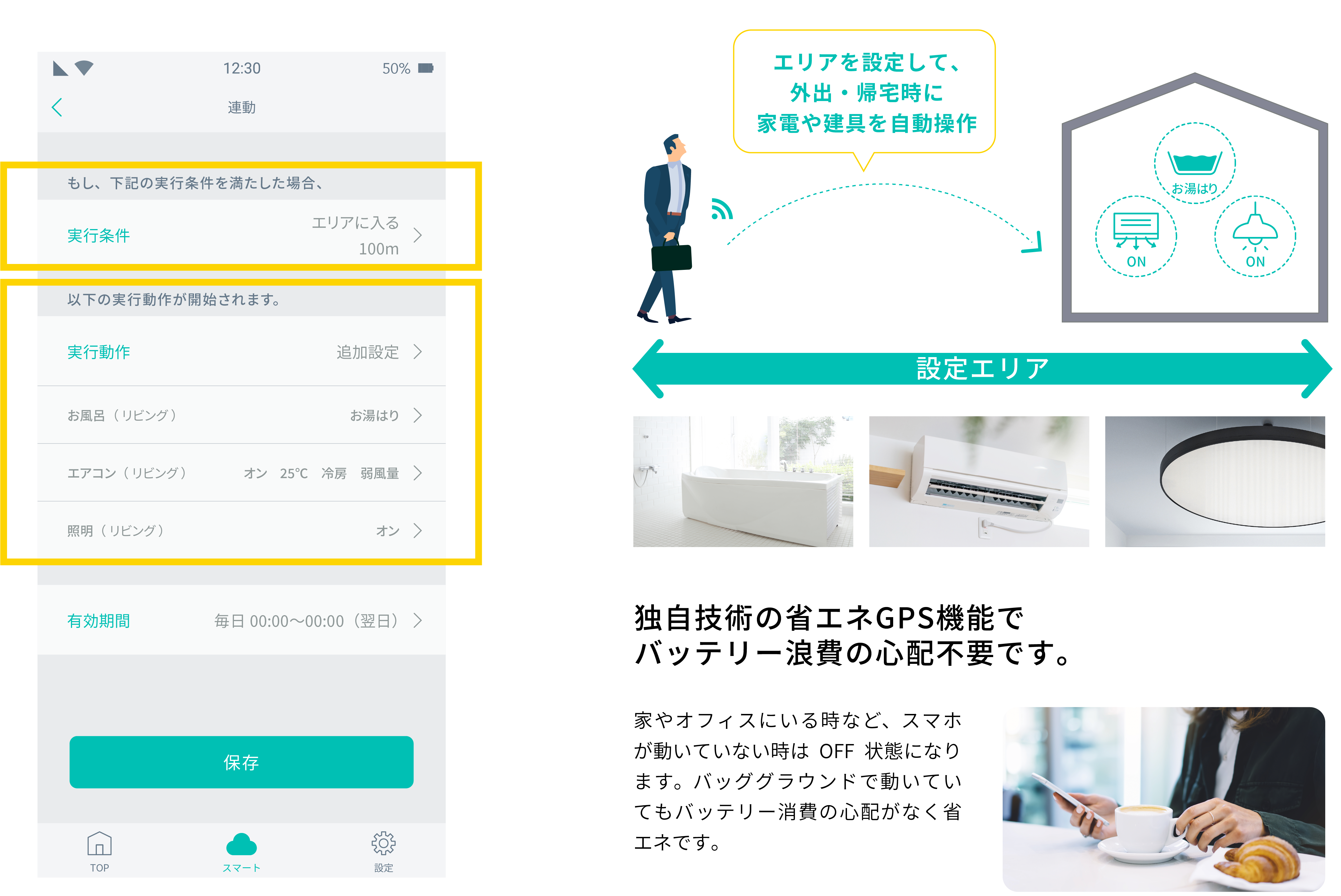 たとえば、自宅近くまで帰って来たらエアコン・照明ON、お湯はりを自動で開始