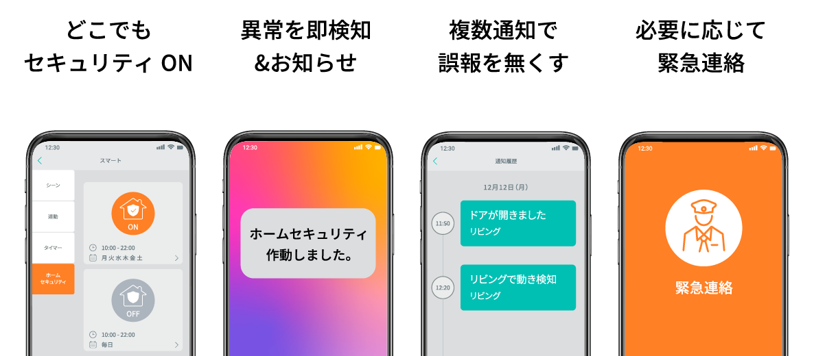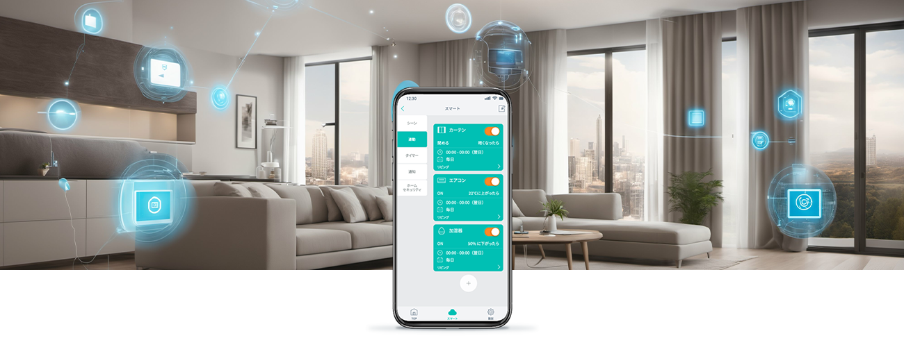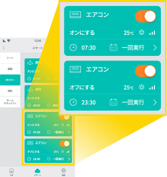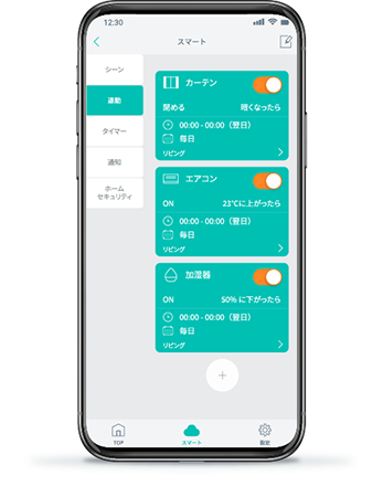 「照明を平日は7:00に、週末は8:30にON」等、生活パターンに合わせたタイマーを1分単位で設定可能。複数の機器をまとめてセットする事もできます。睡眠の質を向上させたり、生活を効率化させたりと、快適なライフスタイルを実現できます。