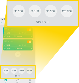 30分後、60分後…といったように、今だけ使いたい切タイマーはスマホをワンタッチすればセット完了。生活パターンが不規則な時は、これで消し忘れを防止できます。